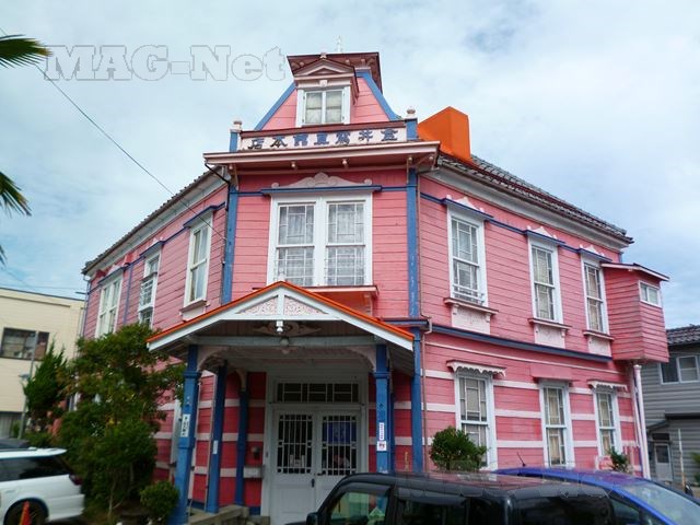 「北方文化博物館新潟分室」の先のピンク色をした洋館は、「金井写真館本館」です。