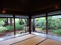苔の蒸した門の屋根は、雨上がりの武家屋敷に鮮やかな緑を放っています。