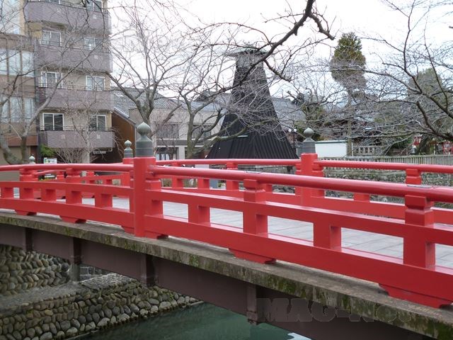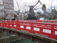 さらに南側には、朱塗りの欄干を構えた橋の向こうに、木造の塔が見えます。