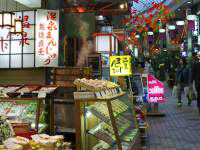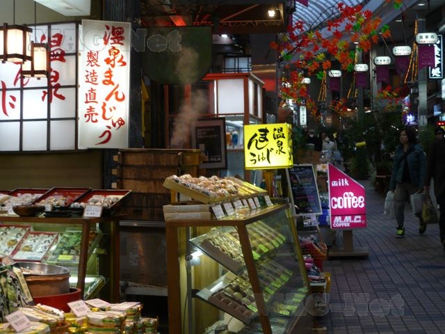 それでは、ロータリーから延びる仲見世を進んでいきます。 ひもの、温泉まんじゅうを眺めながら、名店街の下り坂を進んでいきます。