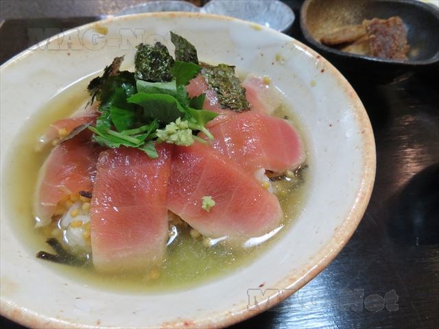 「まご茶漬け」と言って、マグロの刺身をご飯の上に乗せ、出汁を掛けていただきます。