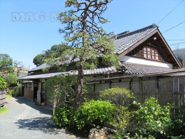 近藤家陣屋の庭園に建てられた旅館で、木造2階建の切妻造りの主屋がまず目に入ります。