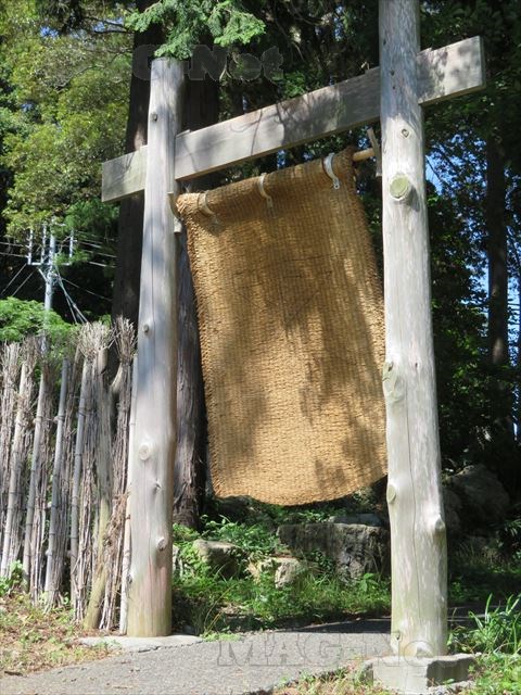 通りから逸れた山道に、むしろで覆い隠されたような門に似たものがあります。