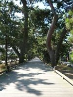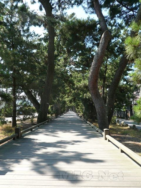 両側に松が続く遊歩道で、頭の上から照りつける陽射しに、浜からの風が実に心地よいのです。
